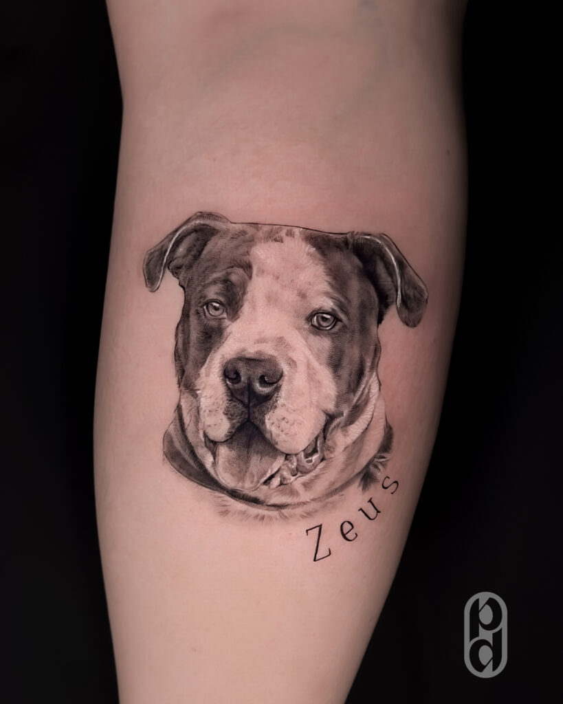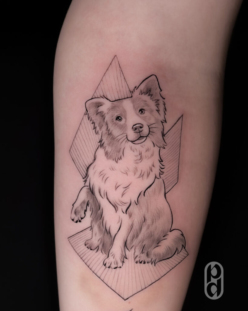 A técnica de fineline aplicada ao retrato pet é perfeita para quem busca uma representação sutil, elegante e minimalista do seu animal de estimação.
